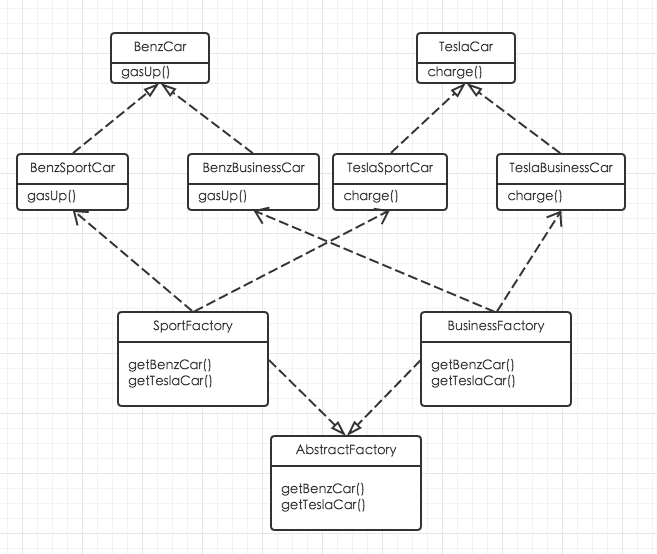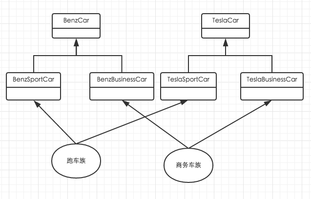 本文的例子采用一个汽车代工厂造汽车的例子。假设我们是一家汽车代工厂商,我们负责给奔驰和特斯拉两家公司制造车子。我们简单的把奔驰车理解为需要加油的车,特斯拉为需要充电的车。其中奔驰车中包含跑车和商务车两种,特斯拉同样也包含奔驰车和商务车。