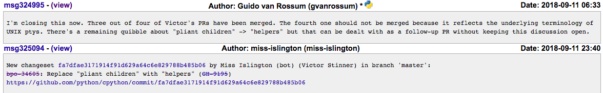Victor Stinner 在他的 bug report 中解释说,出于多元化的考虑,尽量避免出现与奴隶制相关的术语反而可能会更好,像 ‘master’ 和 ‘slave’ 这种。他还指出之前就已有关于这个问题的投诉,但都是私下提出的 —— 以避免引起激烈的争论。