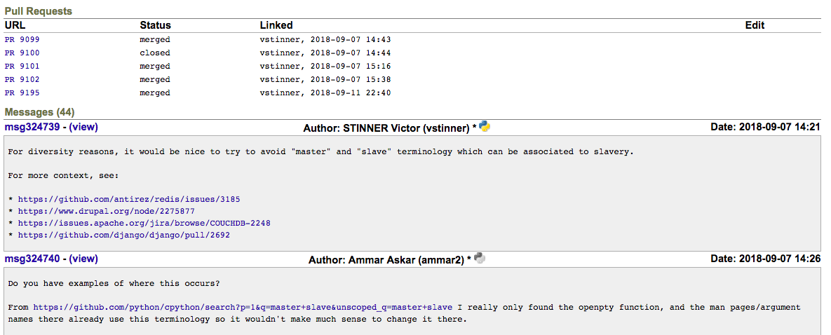 同样是2018年9月7日,在 Red Hat 工作的 Python 开发者 Victor Stinner 公开提交了 4 个 PR,希望能将 Python 文档和代码中出现的 “master” 和 “slave” 修改为像 “parent” 和 “worker” 这样的术语,以及对其他类似的术语也进行修改。
