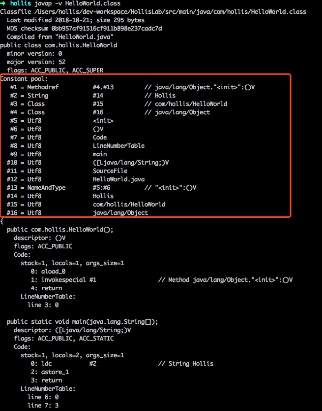 这也就可以印证前面的常量池中还包含一些com/hollis/HelloWorld
