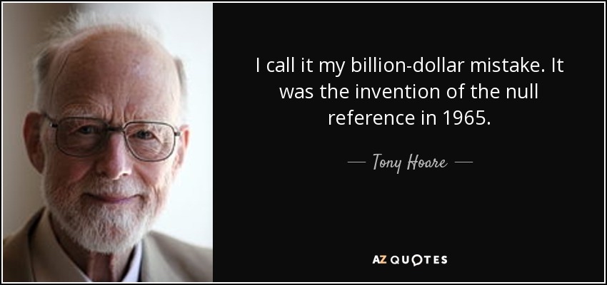 我把 null 引用称为自己的十亿美元错误。它的发明是在1965 年,那时我用一个面向对象语言( ALGOL W )设计了第一个全面的引用类型系统。我的目的是确保所有引用的使用都是绝对安全的,编译器会自动进行检查。但是我未能抵御住诱惑,加入了Null引用,仅仅是因为实现起来非常容易。它导致了数不清的错误、漏洞和系统崩溃,可能在之后 40 年中造成了十亿美元的损失。