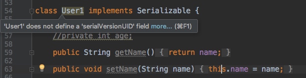 为了确保我们不会忘记定义serialVersionUID,可以调节一下Intellij IDEA的配置,在实现Serializable接口后,如果没定义serialVersionUID的话,IDEA(eclipse一样)会进行提示: