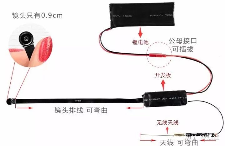针孔摄像头,即超微型摄像机。就是把监控摄像机进行小型化改进,是由开发板+摄像头模组+锂电池(或变压器)构成。主要具备远程、夜视、隐蔽、偷拍等功能。