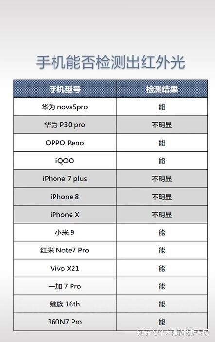 下图是网友整理的可以常见机型,记录了哪些手机可以检测红外光