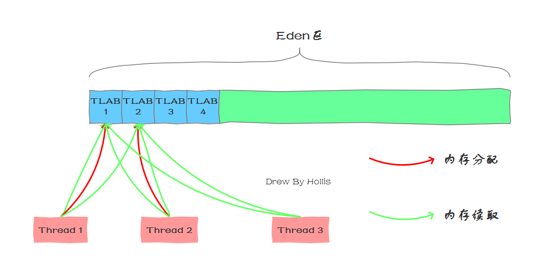 也就是说,虽然每个线程在初始化时都会去堆内存中申请一块TLAB,并不是说这个TLAB区域的内存其他线程就完全无法访问了,其他线程的读取还是可以的,只不过无法在这个区域中分配内存而已。