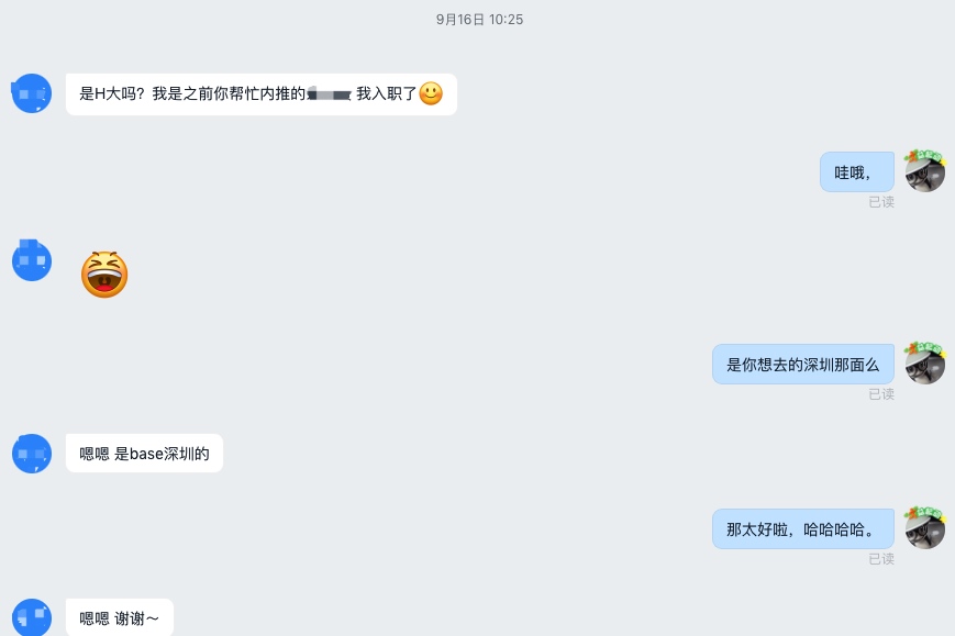 就在上周,我在钉钉上又收到一个消息。我刚刚推荐过的一个朋友,成功的入职了深圳部门: