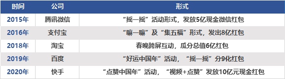 从2015年,微信摇一摇红包引发全民互动狂欢,微信支付一举成名开始,与春晚合作发红包就成了各大互联网巨头争先抢夺的热点。