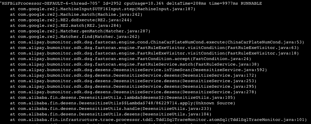 这个工具在打印日志过程中会进行脱敏,脱敏框架会调用Google的re2j进行正则表达式的匹配。