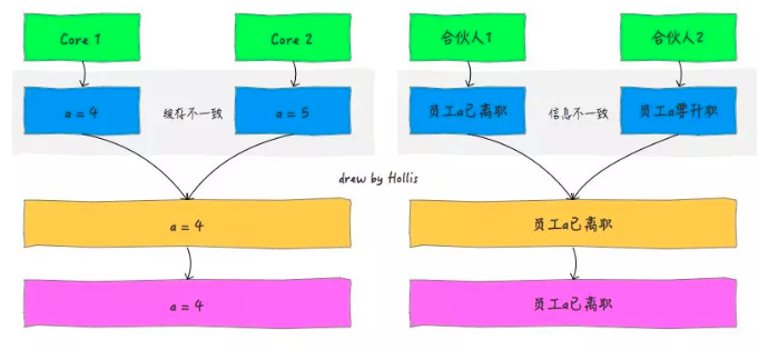 多核CPU,多线程。每个核都至少有一个L1 缓存。多个线程访问进程中的某个共享内存,且这多个线程分别在不同的核心上执行,则每个核心都会在各自的caehe中保留一份共享内存的缓冲。由于多核是可以并行的,可能会出现多个线程同时写各自的缓存的情况,而各自的cache之间的数据就有可能不同。