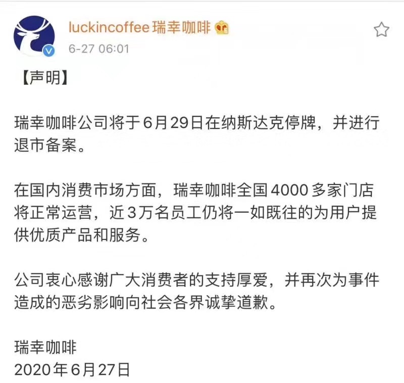 在此之前,5月15日瑞幸收到过纳斯达克的退市通知,于6月17日收到了第二次,挣扎无果后,于6月27日决定接收退市的命运。