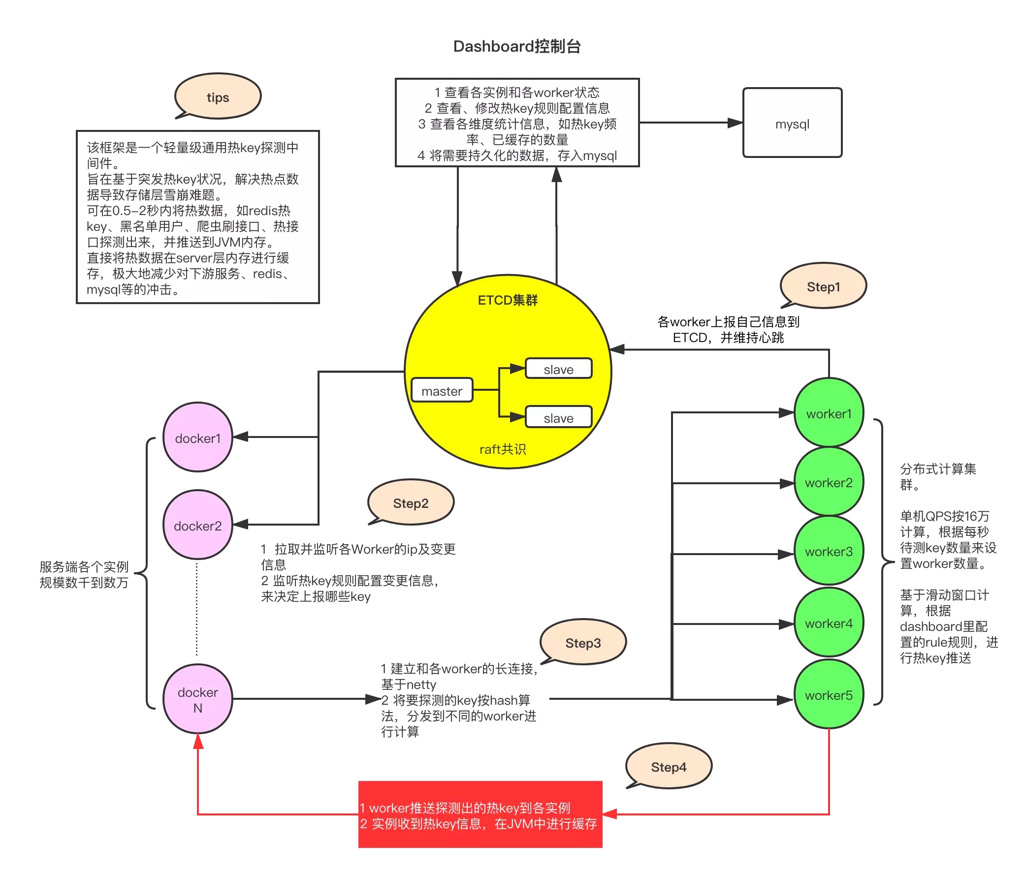 然后对这些热数据、热用户等,推送到所有服务端JVM内存中,以大幅减轻对后端数据存储层的冲击,并可以由使用者决定如何分配、使用这些热key(譬如对热商品做本地缓存、对热用户进行拒绝访问、对热接口进行熔断或返回默认值)。