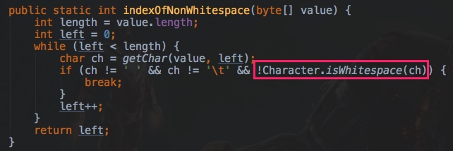 而且为了识别这些空格字符,从Java 1.5开始,还在Character类中添加了新的isWhitespace(int)方法。该方法使用unicode来标识空格字符。你可以在http://jkorpela.fi/chars/spaces.html 了解更多关于unicode空格字符的信息。