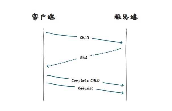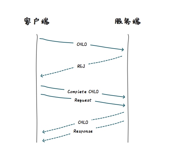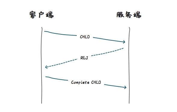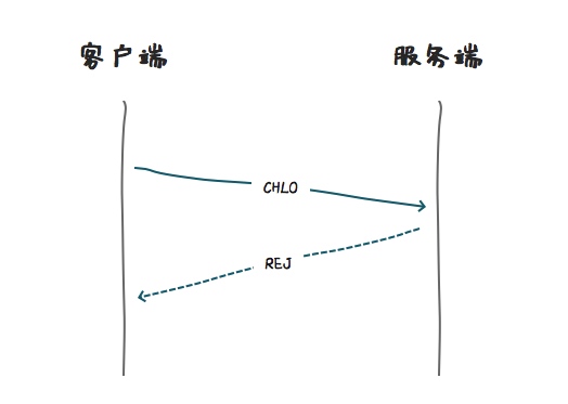 在连接开始建立时,客户端会向服务端发送一个打招呼信息,(inchoate client hello (CHLO)),因为是初次建立,所以,服务端会返回一个拒绝消息(REJ),表明握手未建立或者密钥已过期。
