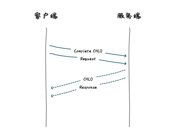 在发送了Complete CHLO消息给到服务器之后,为了减少RTT,客户端并不会等到服务器的响应,而是立刻会进行数据传输。