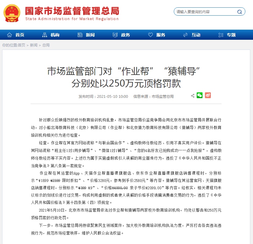 两个月过后,北京市市场监管局依法对作业帮和猿辅导两家校外教育培训机构,均处以警告和250万元顶格罚款的行政处罚。随后对新东方、学而思等15家校外培训机构分别予以顶格罚款,共计3650万元。