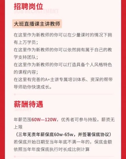 而就在几个月前高途课堂还开出"保底60-65万元"的高薪招聘条件,宣称要招聘1万名老师,可如今手握Offer却入不了职才是面试者的窘境。甚至更有应届生戏称,去年年薪超百万,今年想拿到7-8千的offer都得烧香拜佛。