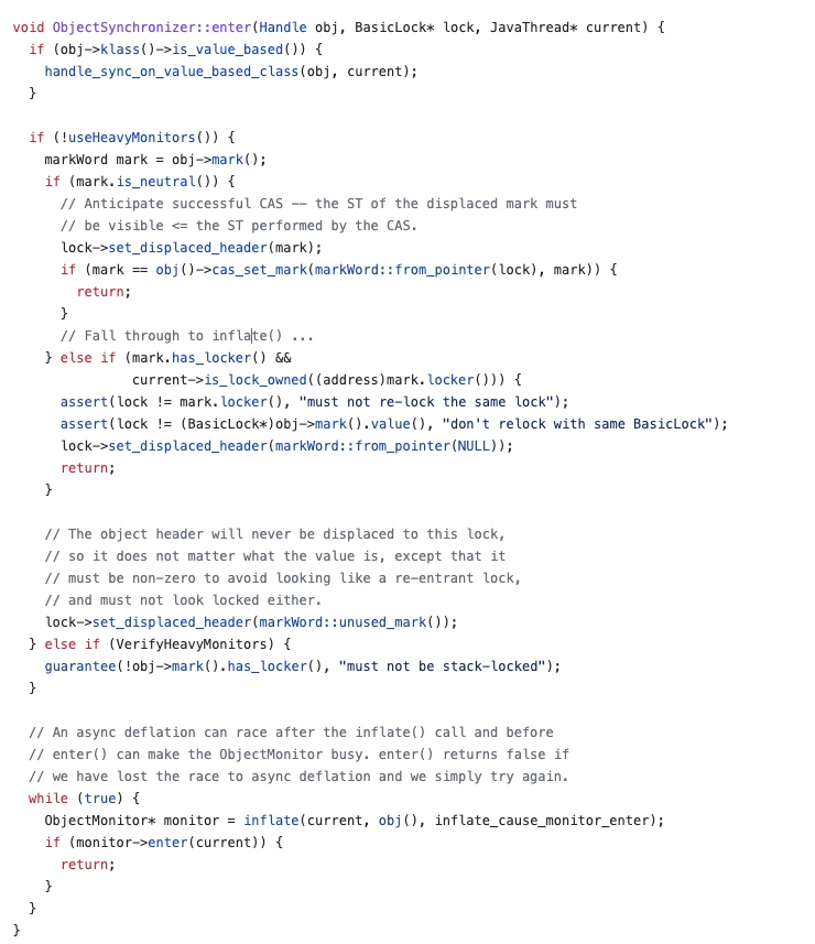 对象加锁的入口在ObjectSynchronizer::enter(h_obj, lock, current); 这个方法中(https://github.com/openjdk/jdk/blob/9583e3657e43cc1c6f2101a64534564db2a9bd84/src/hotspot/share/runtime/synchronizer.cpp#L348 )。