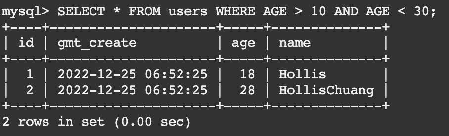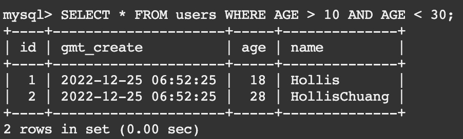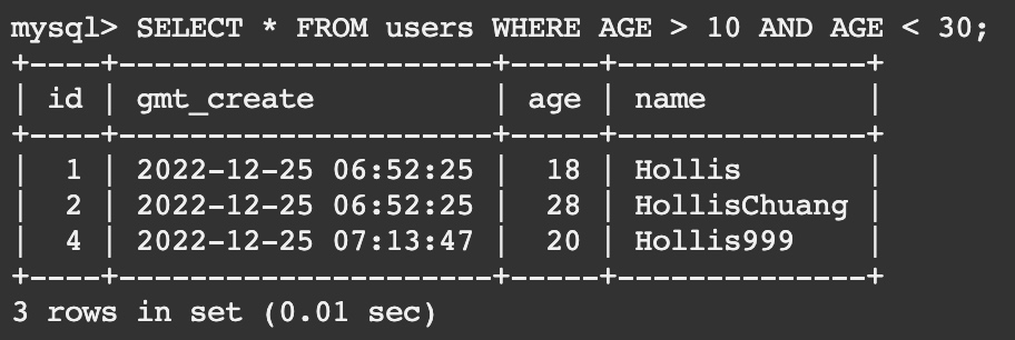 INSERT INTO users(gmt_create,age,name) values(now(),18,'Hollis');