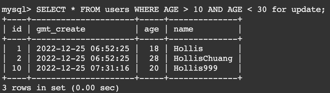 SELECT * FROM users WHERE AGE > 10 AND AGE < 30 FOR UPDATE;