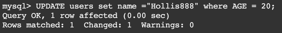 UPDATE users set name ="Hollis888" where AGE = 20;