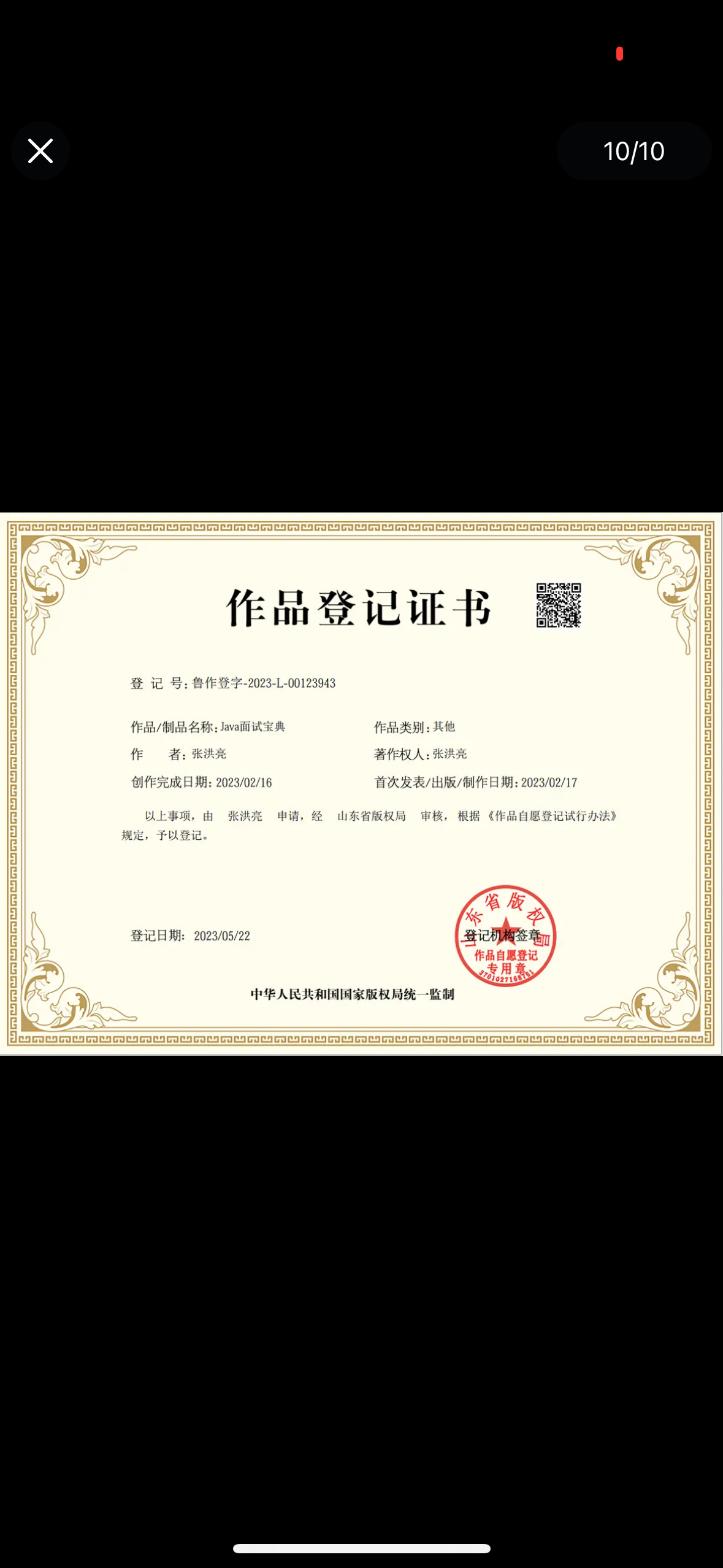 公开发表,作品名称:Java面试宝典,作者:张洪亮,著作权人:张洪亮,登记号:鲁作登字-2023-L-00123943