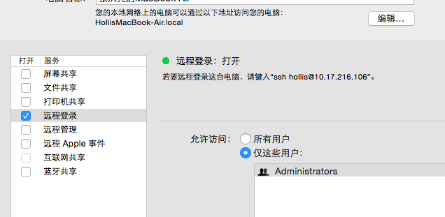 Hollis出品的全套Java面试宝典不来了解一下吗? 场景描述: 在远程服务器上向本地scp文件,或者在其他机器上登录自己的电脑。使用ssh命令或者scp命令时提示连接被拒绝。 解决方法(MAC BOOK): 系统偏好设置——>共享——>打开远程登录