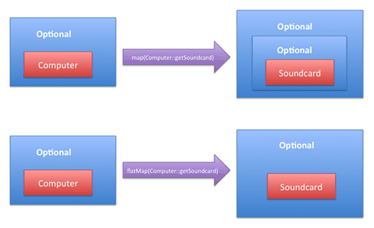 的方法。这个方法可以对一个Optional使用一个函数转换为一个Optional然后把结果(两个Optional)flatten为一个单个Optional,下图给出了map和flatMap的区别: